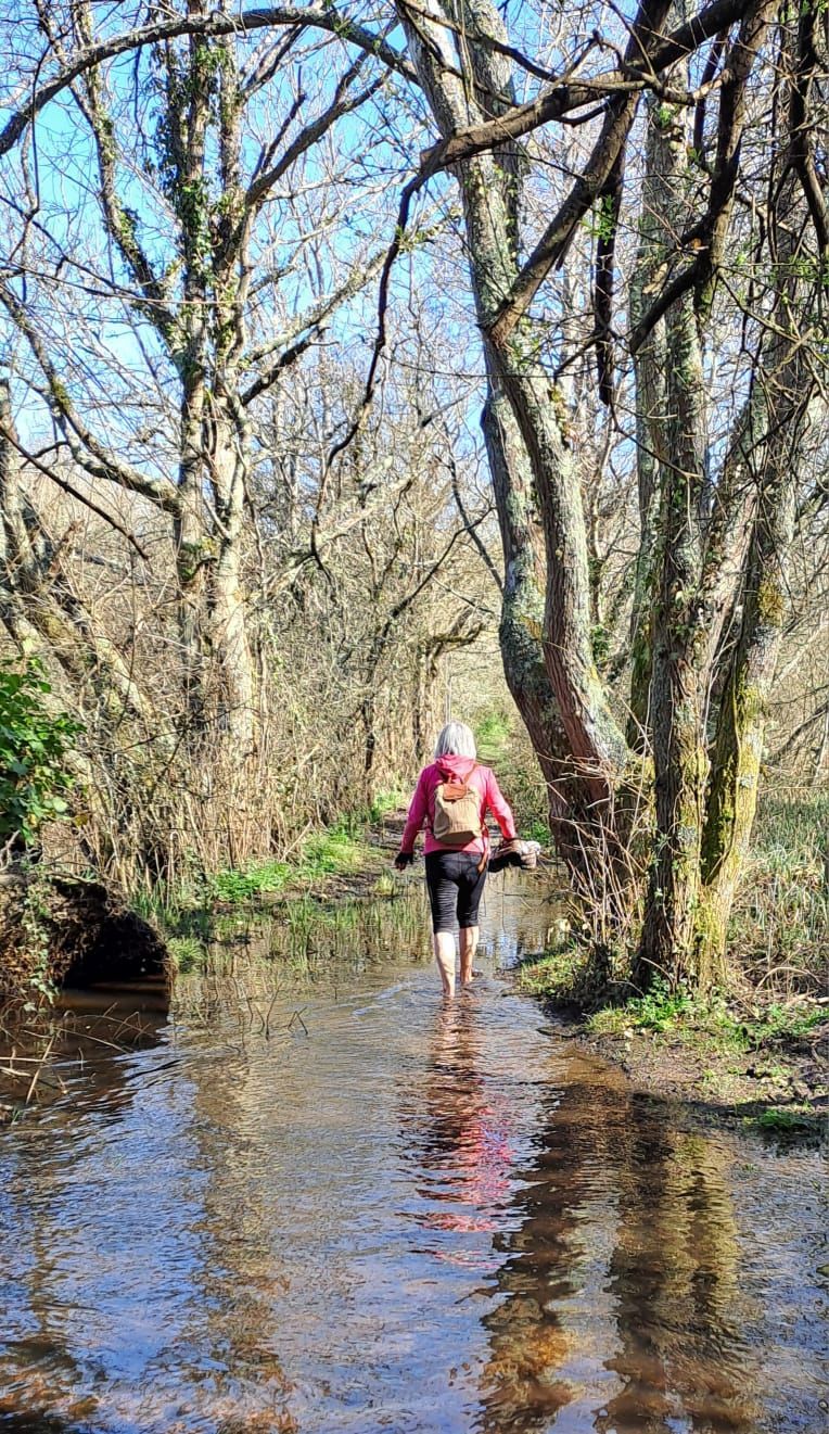 We arrived at Lepe in full sunshine. The tide was high so we walked along the road admiring the views across the Solent. Then we left the road and started on the path. Although we had had a few previous dry days, the path was still quite muddy in parts but we picked our way through…..until we finally came to the path which would take us back to Lepe. A couple with a dog approached and warned us they had had a really bad experience on the path, that we were about to go down. The lady was wearing wellies and explained she had sunk into the mud so much that her welly had got stuck. On their advice we chose an alternative untested route. However we had a different problem.….…….. the path was totally flooded with a flowing stream. One of our group valiantly went ahead to test the depth but ended up with boots submerged under the water. So two of our party decided to avoid getting wet boots and opted to remove socks and boots and waded through the water amid much laughter. This ‘interesting’ walk finished with a welcome cup of coffee at Lepe cafe. All in all, a memorable walk with of course plenty of chat!